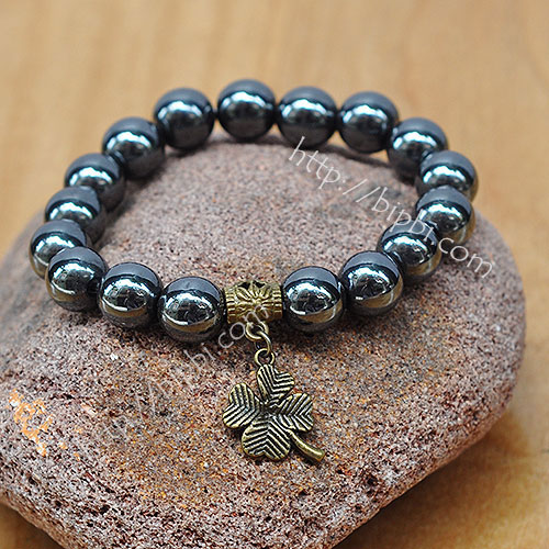 Vòng tay đá hematite khỏe khoắn, nam tính với điểm nhấn đặc biệt là một lá cỏ 4 lá, biểu tượng của sự may mắn, màu đồng cổ.